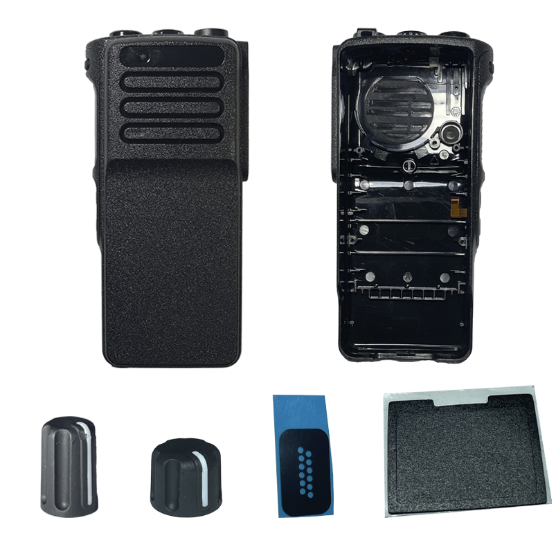 Фронтальна панель корпусу радіостанції Motorola DP4400, DP4400e, DP4401, DP4401e в комплекті з силіконовою кнопкою екстреного виклику помаранчевого кольору, ручка перемикання каналів та ручка гучності, а також пилозахисні наліпки
